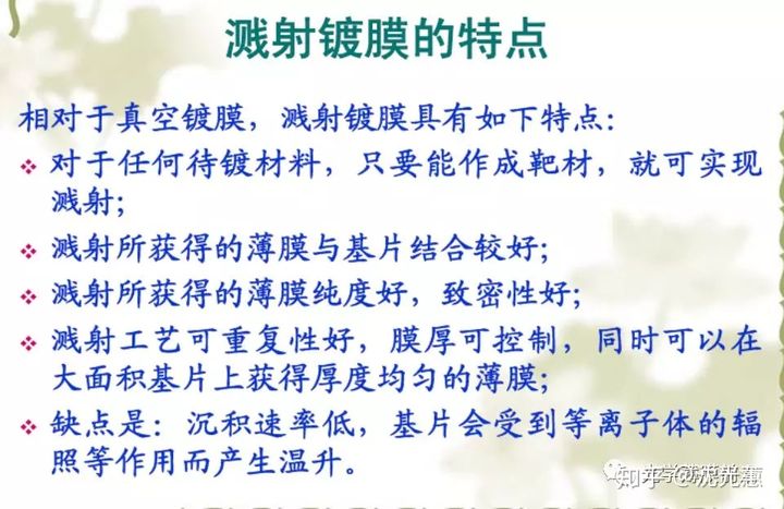 濺射法也具有自己的一些優(yōu)勢,包括在沉積多元合金薄膜時化學成分容易控制,沉積層對襯底的附著力較好等。